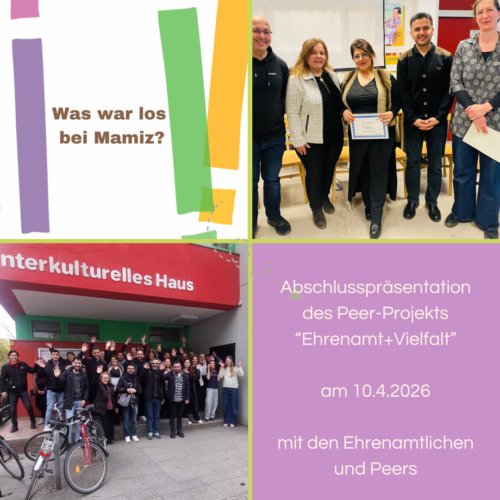 Am Freitag, den 10.4.2026 fand die Abschlußpräsentation unseres Projekts „Ehrenamt+Vielfalt“ im Interkulturellen Haus statt. Im Rahmen des Projekts wurden fünf Ehrenamtliche mit Flucht- bzw. Migrationsgeschichte „on-the-job“ in der Ehrenamtsvermittlung und Öffentlichkeitsarbeit geschult. Zusammen haben wir in 5 Monaten 21 andere Ehrenamtliche in gemeinnützige Organisationen in ehrenamtliche Tätigkeiten vermittelt – z.B. in die Fröbel-Kita in Treptow, zu Schöneberg hilft e.V., in die Fahrradwerkstätten Rückenwind e.V. und Garage10 u.a. Bei der Veranstaltung erhielten die Teilnehmenden Ehrenamts-Zertifikate und konnten ihre Tätigkeiten anderen Interessent*innen vorstellen und miteinander ins Gespräch kommen.
