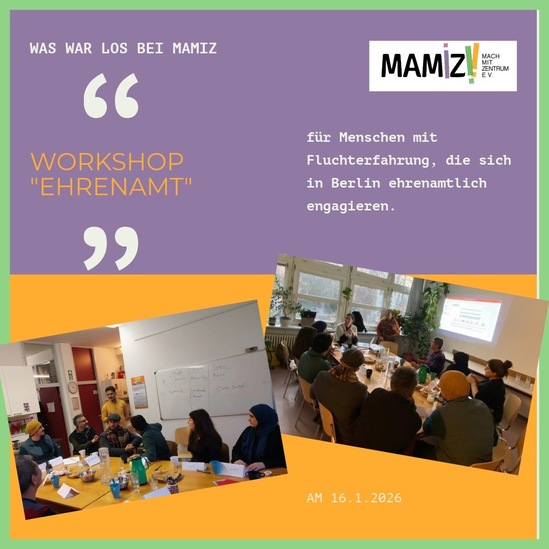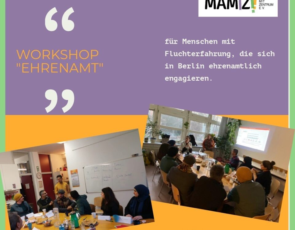 für Mamiz-Projektteilnehmende im IKH (mit Voranmeldung). Die Workshopreihe wird gefördert vom House of Resources Berlin und dem Fonds “Auf Augenhöhe”/Projekt “Ehrenamt+Vielfalt”.