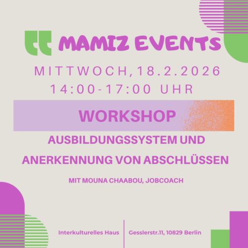 Die Mamiz-Ehrenamtliche Mouna Chaabou, die auch Jobcoachin ist, gibt eine Orientierung in das System der Berufsausbildung in Deutschland und erklärt, wie man und frau ihre Bildungs- und Berufsabschlüsse anerkennen lassen können. Für die Teilnehmer*innen unserer Programme: Ehrenamtlich Engagierte mit Flucht- oder Migrationsgeschichte. Mit Sprachmittlung türkisch, persisch, russisch, arabisch.
